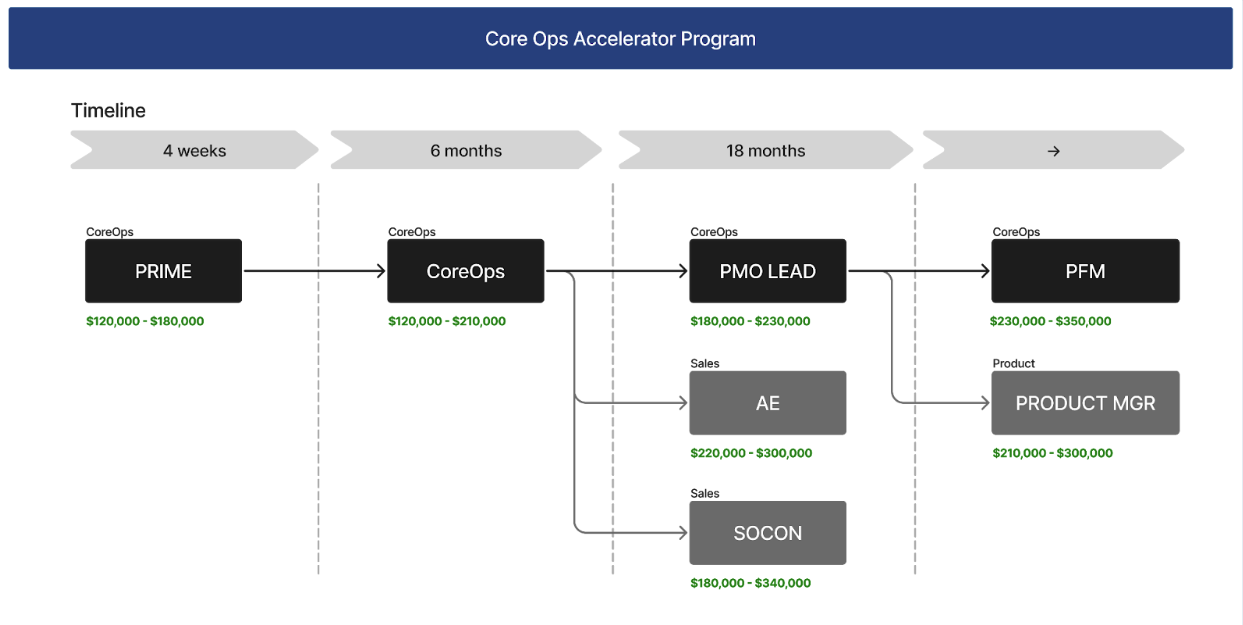 After PRIME, CoreOps team embeds as PMOs, focused on the delivery of our customer implementations. After approximately 6 months the first review is performed and members of the cohort either are promoted upward, laterally, or not eligible until the next review again in 6 months. After 24 months total the program ends and team members are assigned a permanent home either in Sales, Solutions, PMO, Product, etc.